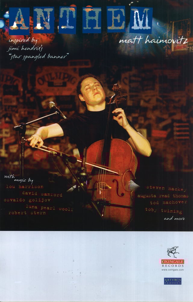 Matt Haimovitz’s 50-state Anthem tour in 2003 celebrated living American composers, and featured his own arrangement of Jimi Hendrix’s “Star-Spangled Banner.” He was the first classical artist to play at New York’s infamous CBGB club, in a performance filmed by ABC News for “Nightline UpClose.”